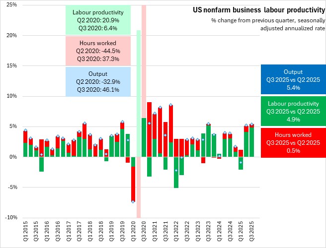US nonfarm business sector labour productivity was revised to a seasonally adjusted annualized rate of 4.9% in Q3 2025. Accelerated growth in labour productivity combined with a 0.5% rise in hours worked lifted US business sector output by 5.4%.