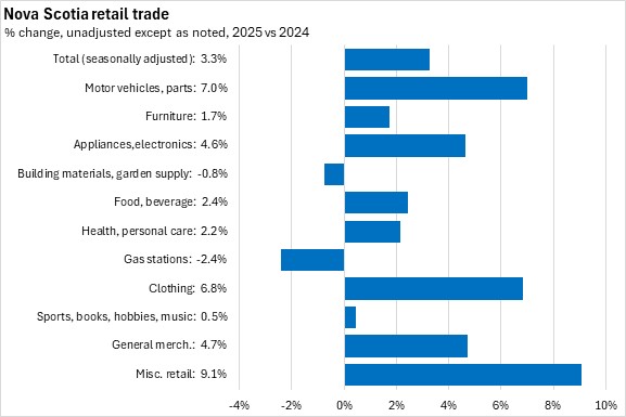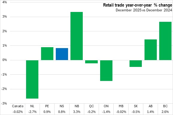 Nova Scotia retail trade increased 3.3% in 2025. Nationally, retail trade was up 4.0% for the year. All provinces reported annual retail trade growth, led by British Columbia. Prince Edward Island and Saskatchewan reported the slowest growth rates.