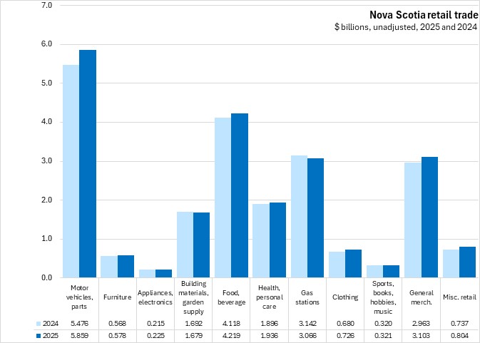 In dollar terms, motor vehicles/parts ($5.859 billion), food/beverage ($4.219 billion), general merchandise ($3.103 billion) and gas stations ($3.066 billion) contributed the most to Nova Scotia's retail sales in 2025.