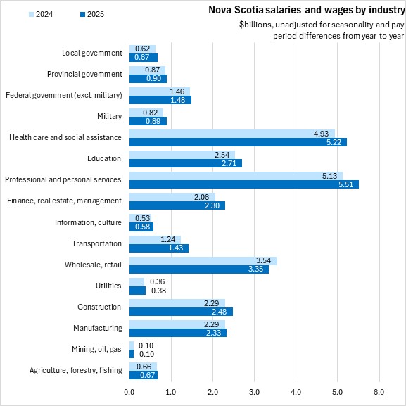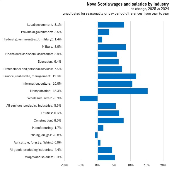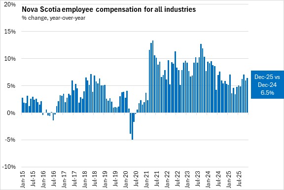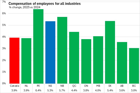 Nova Scotia's employee compensation for all industries was up 5.3% in 2025 when compared with 2024. National employee compensation grew 3.9%. All provinces recorded annual gains in employee compensation in 2025, with the fastest gain reported in Prince Edward Island and the slowest in British Columbia.