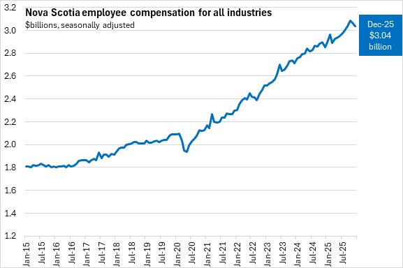 Total compensation of employees for all industries increased by 2.0% in Nova Scotia, rising to $9.19 billion in Q4 2025, the fastest among provinces. National employee compensation was up 0.5% in the fourth quarter of 2025. All provinces recorded quarter over quarter gains in employee compensation, except Alberta.