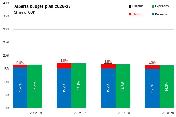 Measured as a share of GDP, the footprint of provincial government in Alberta's economy amounts to 17.1% of GDP in 2026-27. This is projected to shrink slightly to 16.3% of GDP by 2028-29. Alberta's deficit for 2026-27 amounts to 1.9% of projected 2026 nominal GDP. The deficit is projected to shrink to 1.3% of GDP by 2028-29.