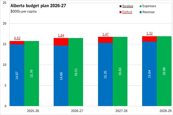 Alberta's 2026-27 Budget expenditures amount to $16,507 per capita, funded by revenues of $14,664 per capita and a deficit of $1,844 per capita. Expenditures per capita are projected to rise by $455 by 2028-29 while per capita revenues rise $974 and the per capita deficit declines by $519.