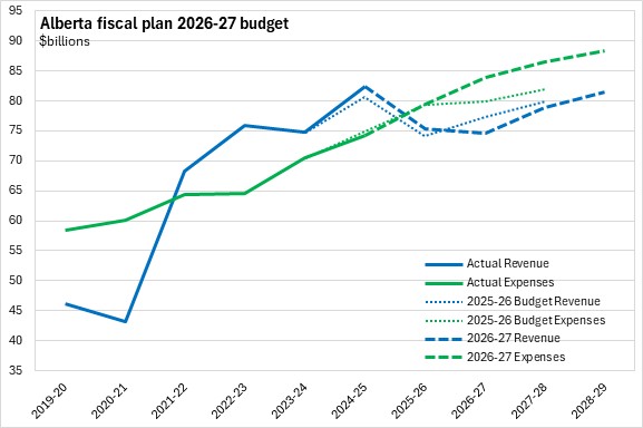 Compared with last year's fiscal plan, Alberta's revenues are projected to be weaker (-$2.84 billion for 2026-27) while expenditures are projected to be higher (+$4.10 billion).