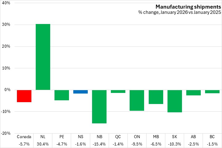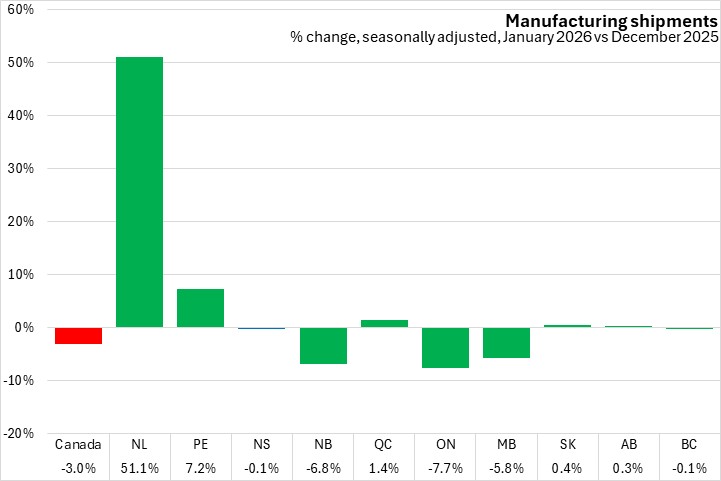Manufacturing shipments were up in five provinces, with Newfoundland and Labrador reporting the largest increase, and New Brunswick having the largest percentage decline among provinces from December to January 2026.