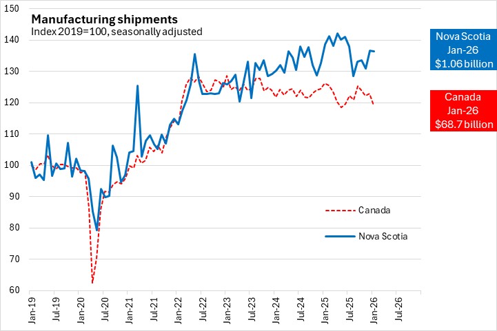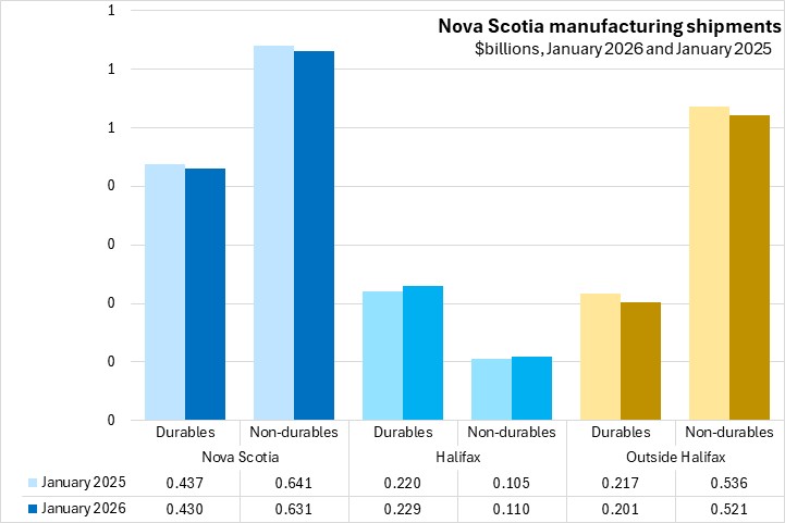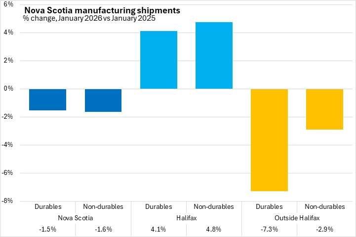 Nova Scotia manufacturing shipments were down year-over-year in January 2026 for both durable and non-durable goods, with gains in Halifax more than offset by declines in the rest of Nova Scotia. Durable goods shipments from Halifax account for more than half of the province's durables output. The majority of Nova Scotia's non-durable manufacturing shipments come from outside the city.