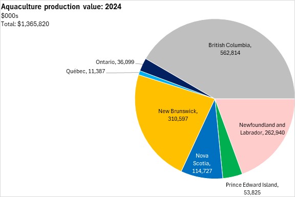 Note: Production and value estimates for finfish and shellfish farmed in Nova Scotia in 2024 have been revised with final estimates. Data for aquaculture production in Alberta, Saskatchewan, and Manitoba was suppressed.