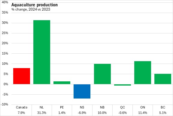 National aquaculture output tonnage increased by 7.9% from 2023 to 2024. Newfoundland and Labrador reported the largest percentage gain in aquaculture production tonnage at +31.3% while Nova Scotia reported the largest decline at -6.9%.