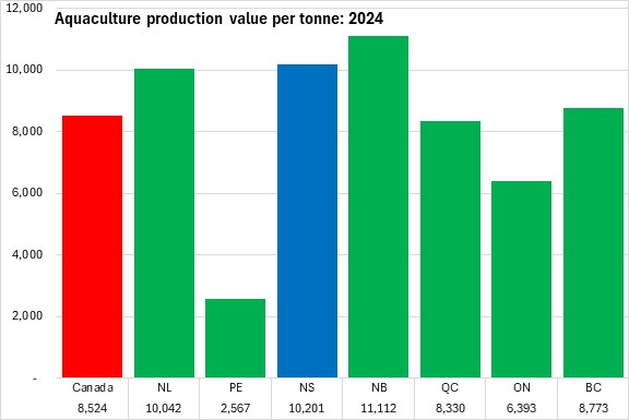 In 2024, the average unit value of Nova Scotia's aquaculture products was above the national average at $10,201 per tonne - the second highest value among provinces after New Brunswick. This was up 2.3% from value per tonne in 2023.