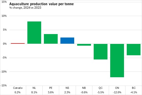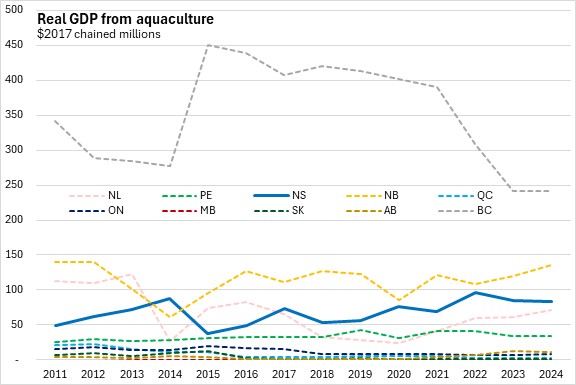 Real GDP in Nova Scotia's aquaculture industry fell by 2.8% in 2024, one of five provinces to report a decline (along with British Columbia, Alberta, Saskatchewan, and Québec).