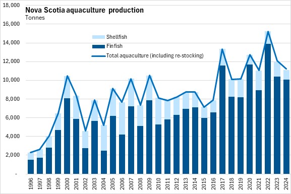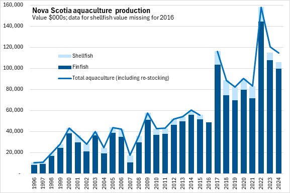 Nova Scotia's aquaculture output volume as well as production value declined in 2023 and 2024 after a sizeable spike in 2022.