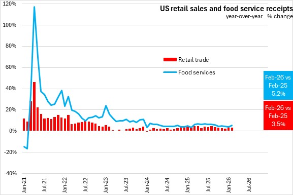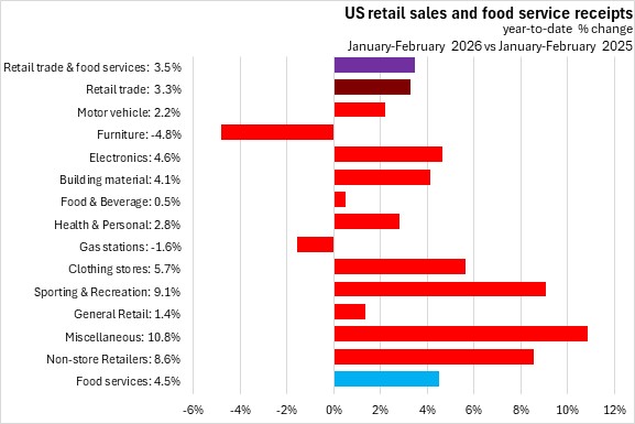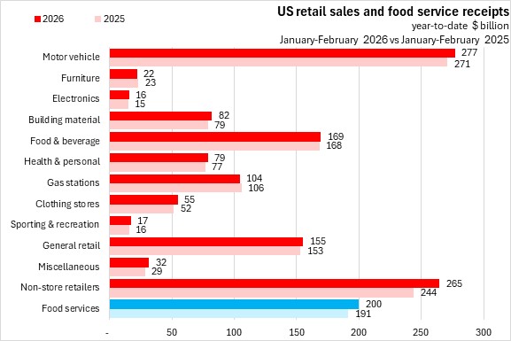 In the first two months of 2026, retail trade and food services receipts were up 3.5% compared to the same period of 2025. US retail sales were up 3.3% with gains in all categories except furniture and gas stations. The fastest gains (in percentage terms) were in miscellaneous, sport/recreation, and non-store retailers. Food service receipts were up 4.5% in January-February 2026.