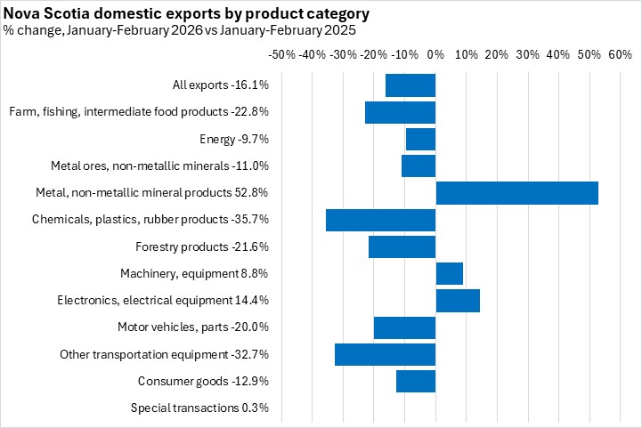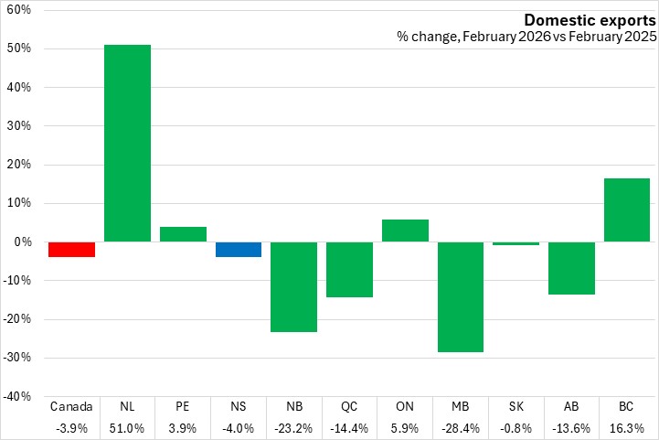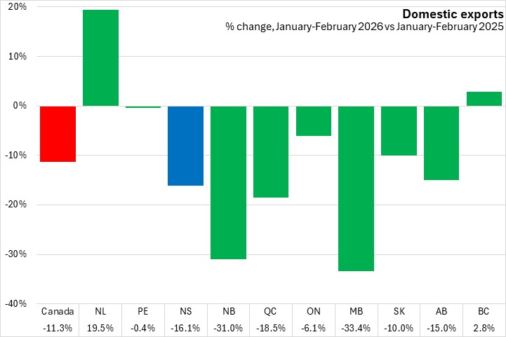 In the first two months of 2026 domestic exports fell 16.1% in Nova Scotia compared to the same period in 2025. Canada's exports declined 11.3% for January-February 2026, with every province except Newfoundland and Labrador and British Columbia reporting declines, led by Manitoba. Newfoundland and Labrador reported the largest year-to-date exports growth.