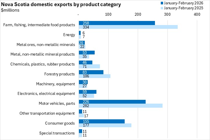 April 02, 2026NOVA SCOTIA INTERNATIONAL GOODS EXPORTS, FEBRUARY 2026 Year-over-year (February 2026 vs February 2025, domestic exports on a customs-basis, unadjusted)
