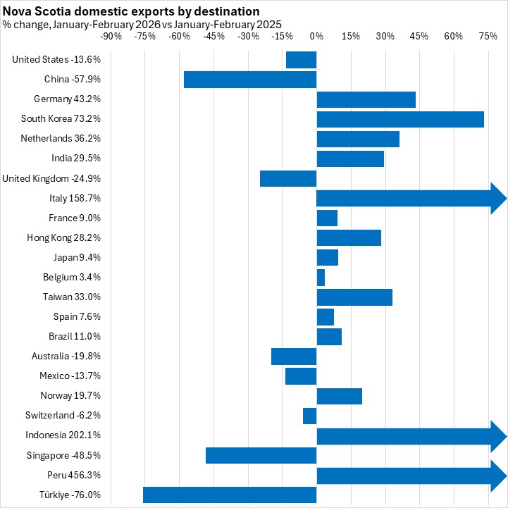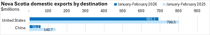 China is Nova Scotia's second largest export destination and exports declined 57.9% to $59.2 million in January-February 2026.