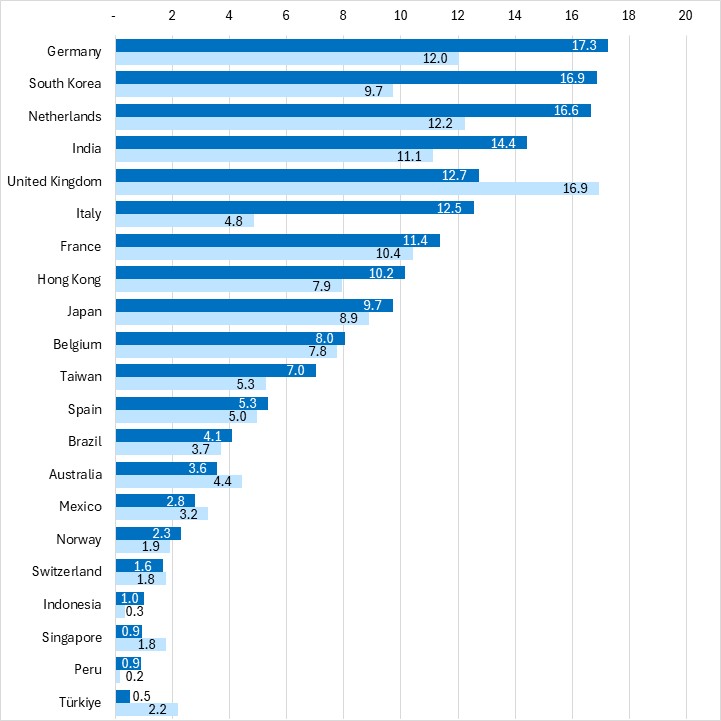 Among the other significant export destinations, year-to-date exports were up most sharply (>20%) to Germany, South Korea, Netherlands, India, Italy, Hong Kong, Taiwan, Indonesia, and Peru. The largest declines (<-20%) in February exports were to China, the United Kingdom, Singapore, and Türkiye.
