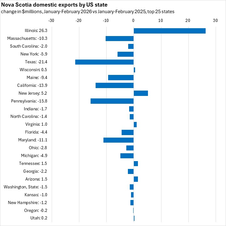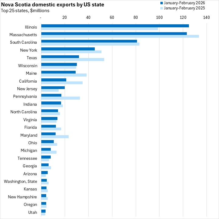 Nova Scotia's exports to the US accounted for 72.2% of exports in January-February 2026. Illinois has surpassed Massachusetts as the largest US state destination for Nova Scotia exports. Massachusetts, Illinois and South Carolina each had a larger year-to-date export value than Nova Scotia's shipments to China. Exports were down for seven of Nova Scotia's top ten US state destinations. The largest dollar value decline was for Texas, while Illinois had the largest dollar value increase.