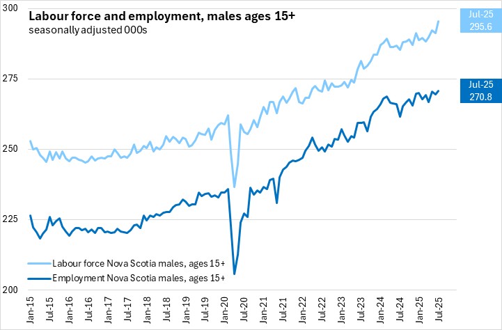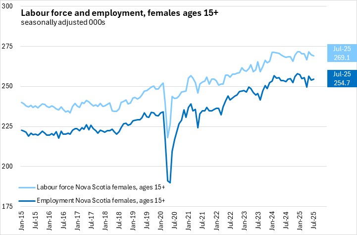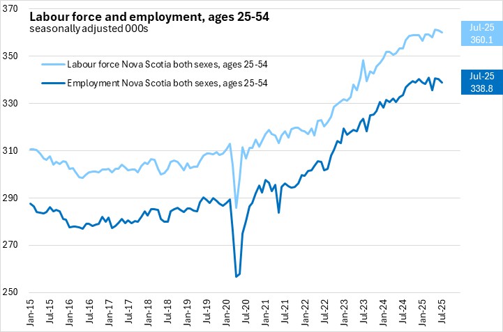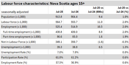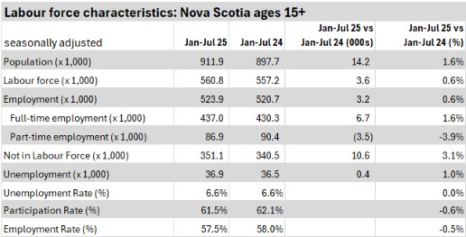 Compared with January-July 2024, Nova Scotia's population over the age of 15 increased by 14,200 (+1.6%), while the labour force grew by 3,600 (+0.6%), and employment increased by 3,200 (+0.6%). The unemployment rate was unchanged, while the participation rate fell by 0.6 percentage points and the employment rate fell by 0.5 percentage points.