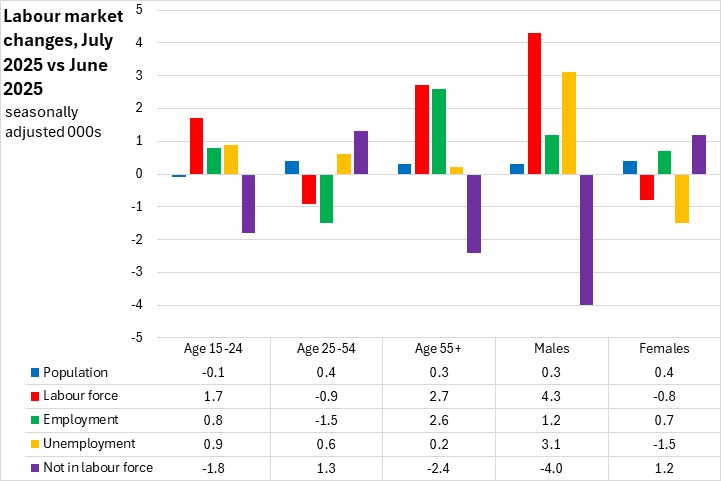 Compared with July 2024, employment and labour force grew across all age and sex cohorts. For core aged and male workers, labour force growth outpaced employment, resulting in higher unemployment. Males reported notably stronger gains in labour force and employment compared to females over the same month last year. With slower growth in labour force and employment, females reported notable growth in those not in the labour force.
