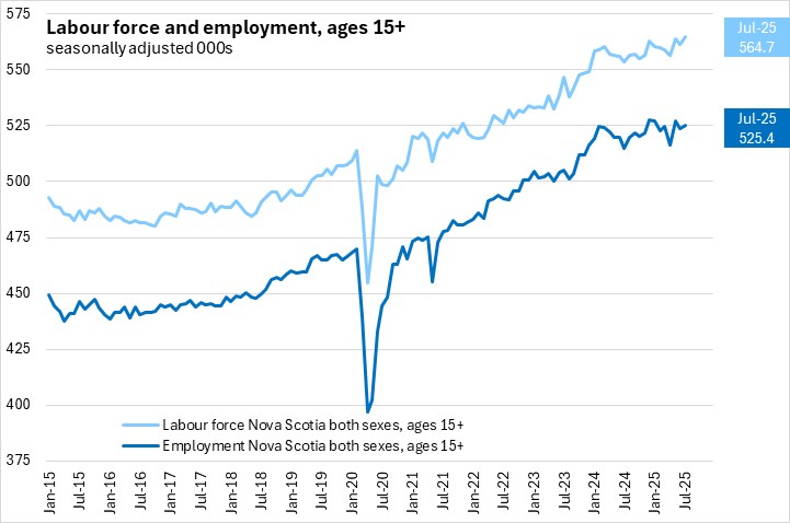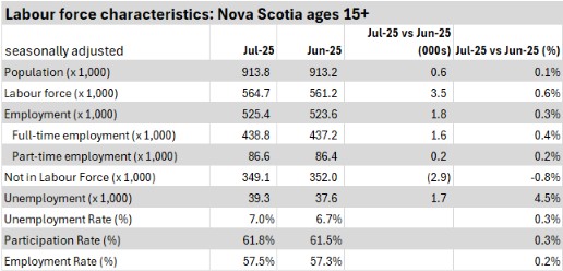 Nova Scotia’s labour force increased by 3,500 (+0.6%) to 564,700 in July 2025.