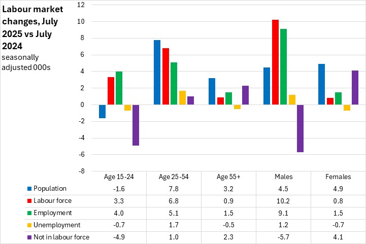 Age and sex cohorts (July 2025 vs July 2024, seasonally adjusted)
