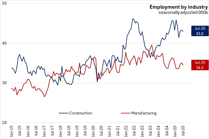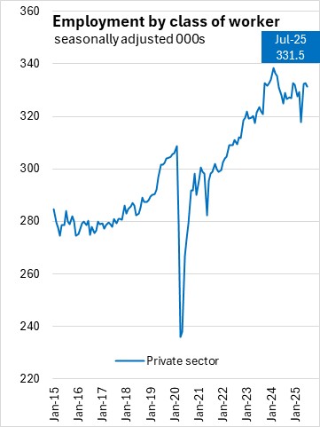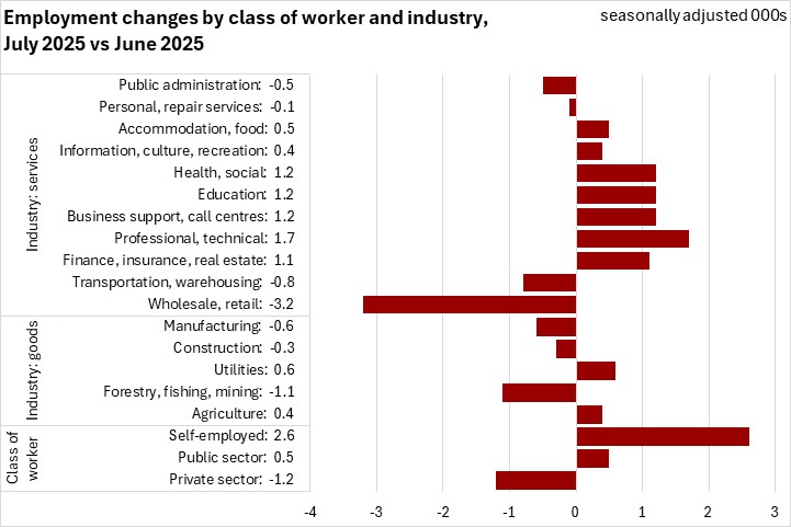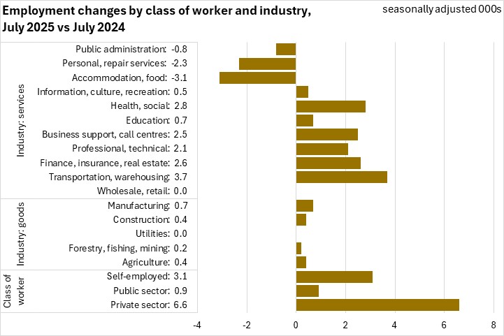 Compared to July 2024, there were employment gains for private sector workers (+6,600, +2.0%), self employment (+3,100, 6.1%), and public sector workers (+900, 0.6%).