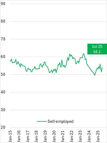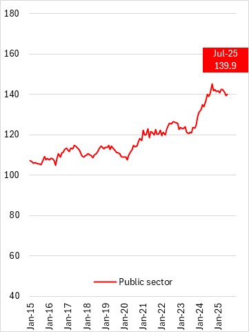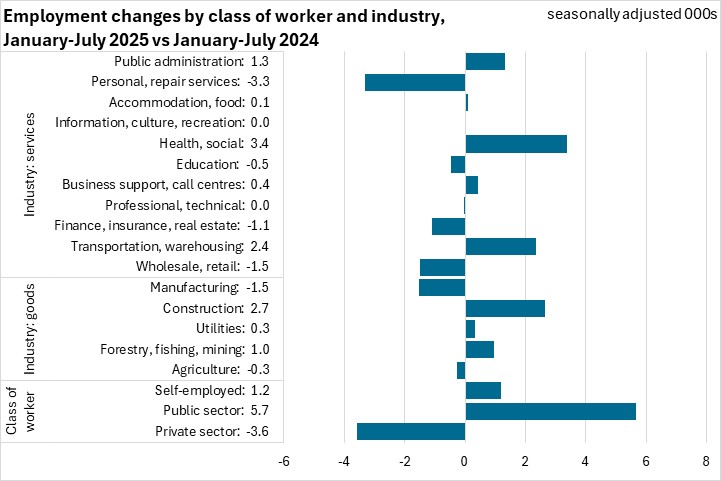 Compared to January-July 2024, gains were strongest for public sector workers (+5,700, +4.2%), with smaller gains in self employment (+1,200, +2.2%). There was a decline in private sector workers (-3,600, -1.1%).