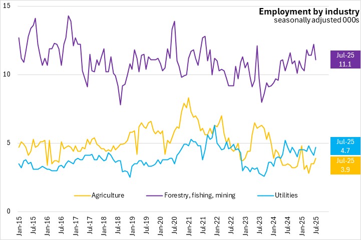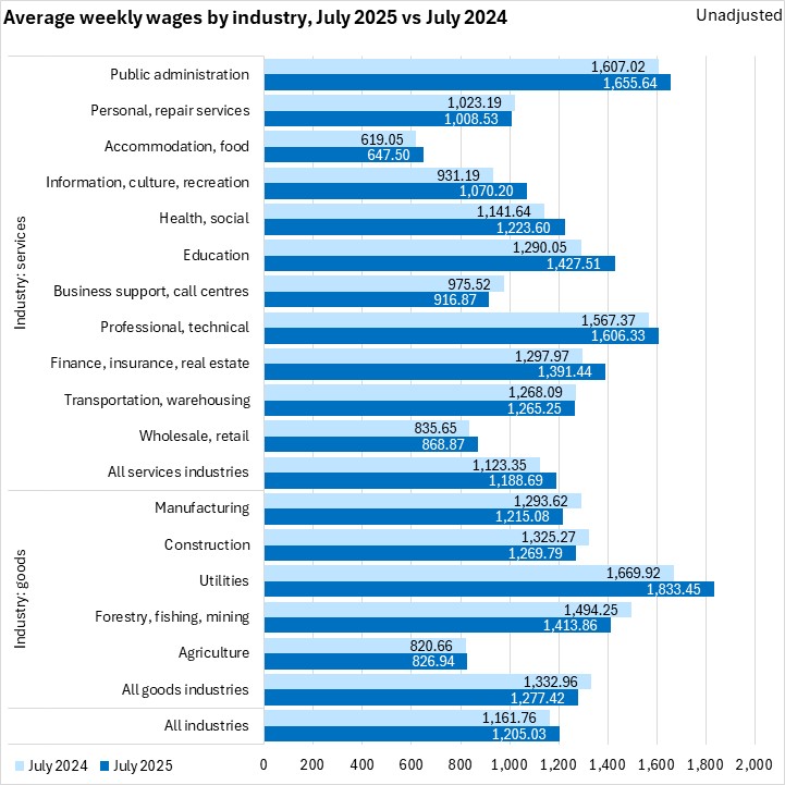 Average weekly earnings across all employees were $1,205.03 in July 2025. The highest average weekly earnings (both full and part time employees) were reported in utilities, professional/technical services, and public administration. The lowest average weekly earnings were in accommodation/food services and agriculture.
