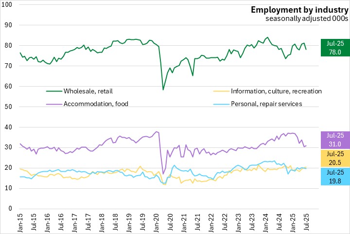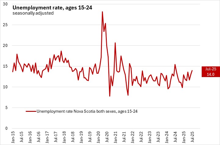 Among youth (ages 15-24), employment grew 800 (+1.2%) and the labour force increased by 1,700 (+2.2%). As employment grew more slowly than labour force, the youth unemployment rate rose 0.9 percentage points to 14.0% in July 2025. The youth participation rate rose 1.5 percentage points to 67.8% while the youth employment rate increased 0.8 percentage points to 58.4%.