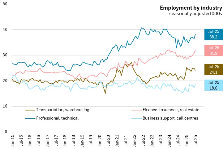 Average weekly earnings increased by 3.7% from July 2024 to July 2025. The fastest gains in average weekly earnings were in information/culture/recreation, education, utilities, health care/social assistance and finance/insurance/real estate. The largest declines in average weekly wages were in manufacturing, followed by business support/call centres and forestry/fishing/mining.