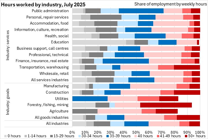 Compared to the provincial average, a larger share of workers in goods producing industries and transportation/warehousing worked more than 40 hours per week in July 2025.