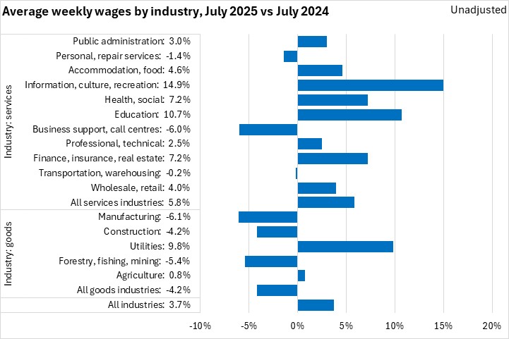 Average weekly earnings (unadjusted, both full time and part time, July 2025 vs July 2024)
