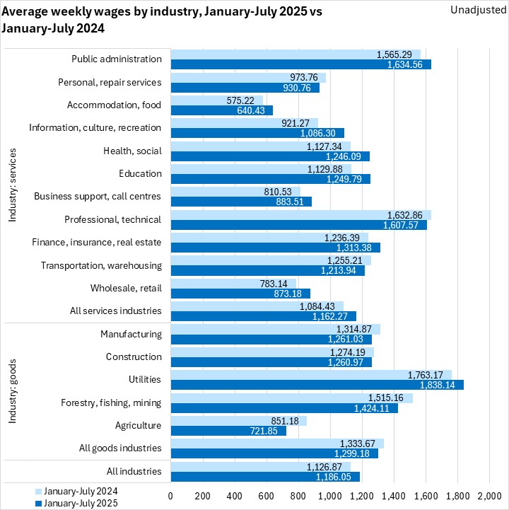 Average weekly earnings in the first seven months of 2025 were highest in utilities, public administration, and professional/technical services. The lowest average weekly earnings were in accommodation/food services, and agriculture in January-July 2025.