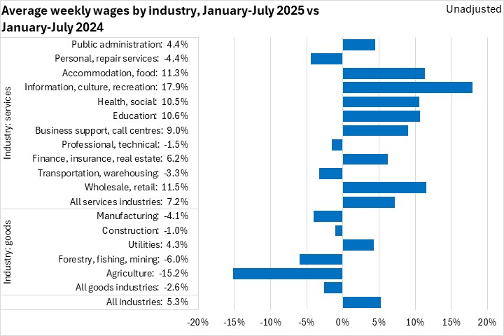 Average weekly earnings increased 5.3% in the first seven months of 2025 compared to the same period of 2024. The fastest gains in average weekly earnings were in information/culture/recreation, accommodation/food services, and wholesale/retail. Agriculture reported the fastest decline in average weekly earnings in January-July 2025.