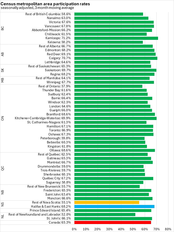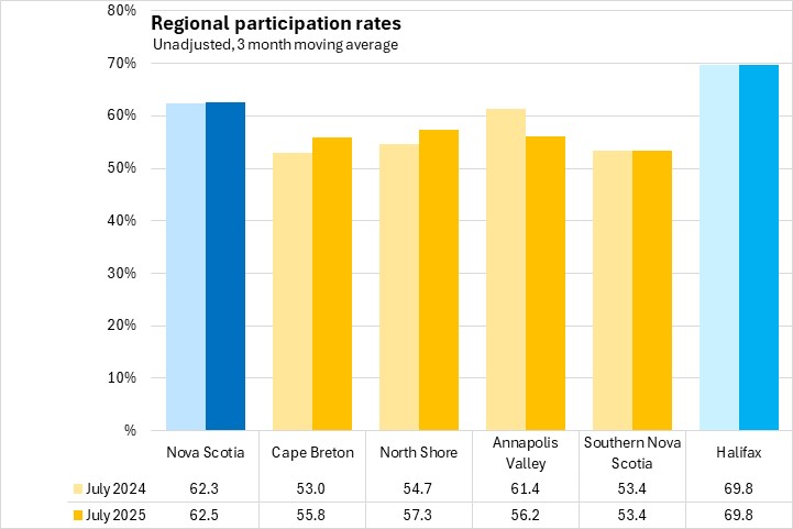 Halifax & East Hant's participation rate was 68.2% in the seasonally adjusted July 2025 three month moving average, while participation rates were 55.1% across the rest of the province.
