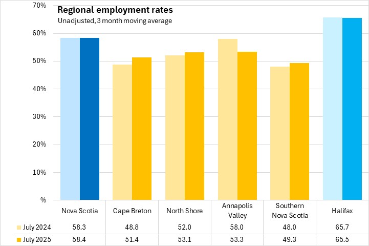 Halifax & East Hants reported an employment rate of 64.5% in the seasonally adjusted July 2025 three month moving average, while the employment rate was 50.5% outside the city.