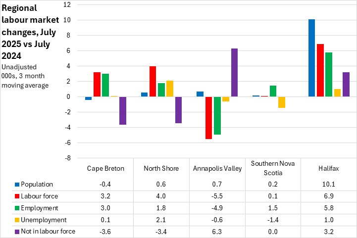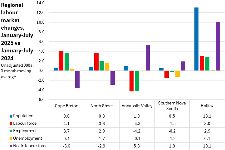 Compared with January-July 2024, labour force and employment increases were concentrated in Cape Breton, the North Shore, and Halifax, all of which reported stronger growth in labour force than employment, resulting in higher unemployment. Lower labour force and employment in the Annapolis Valley and Southern regions have resulted in more people not in the labour force. Halifax saw the strongest population growth, and a large increase in the number of people not in the labour force.