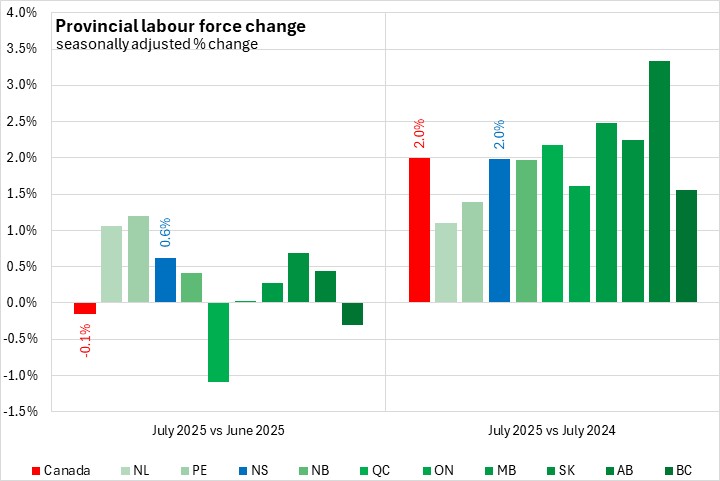 Canada's labour force was down 0.1% from June with eight provinces reporting growth in July 2025. The fastest growth was in Prince Edward Island, while the fastest decline was in Québec.