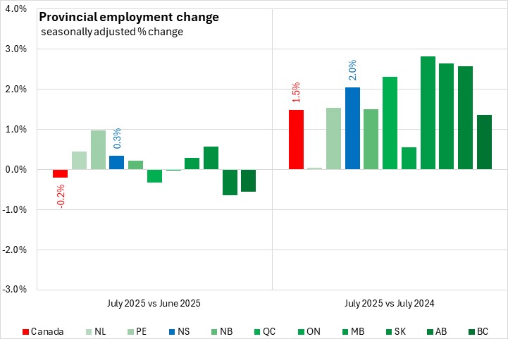 Canada's employment decreased by 0.2% in July 2025. Six provinces reported higher employment in July led by Prince Edward Island. The fastest decline was in Alberta.