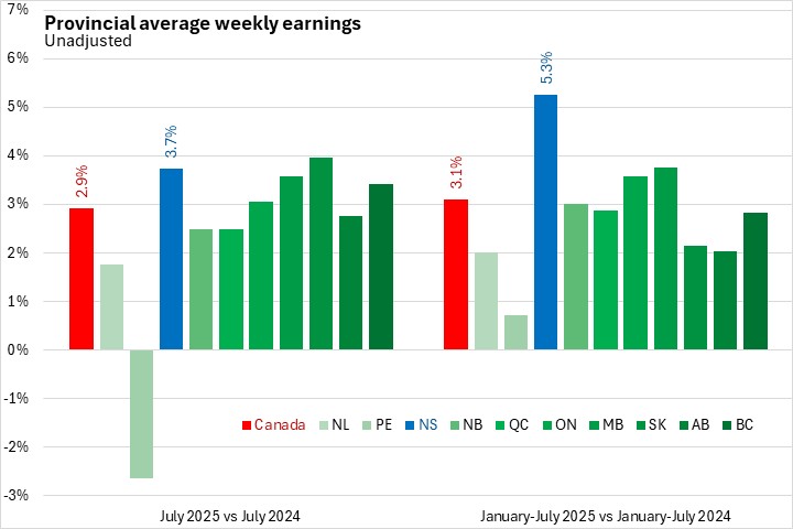 Comparing January-July 2025 with the same months in 2024, Nova Scotia's average weekly earnings were up 5.3% - fastest among provinces. National average weekly earnings were up 3.1% year-to-date with the slowest growth in Prince Edward Island.