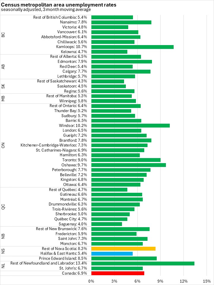 The Halifax & East Hants unemployment rate was 5.4% in the seasonally adjusted July 2025 three month moving average. Outside of Halifax & East Hants the unemployment rate was 8.3%. In central and western provinces, unemployment rates in Census Metropolitan Areas are similar to or higher than unemployment rates outside CMAs. In the Atlantic Provinces unemployment rates are typically higher outside CMAs.