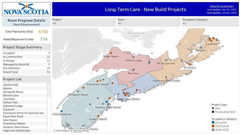 The Government of Nova Scotia is adding new long-term care rooms and replacing older rooms to help meet the needs of seniors in our communities. Stay up to date as projects advance.