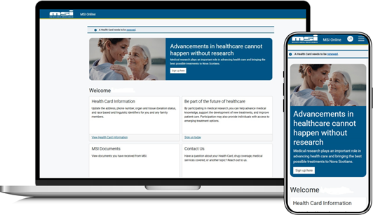 MSI Online is a web-based service for MSI and Pharmacare that helps you update information, renew a Health Card, register for programs and submit inquiries and forms electronically.