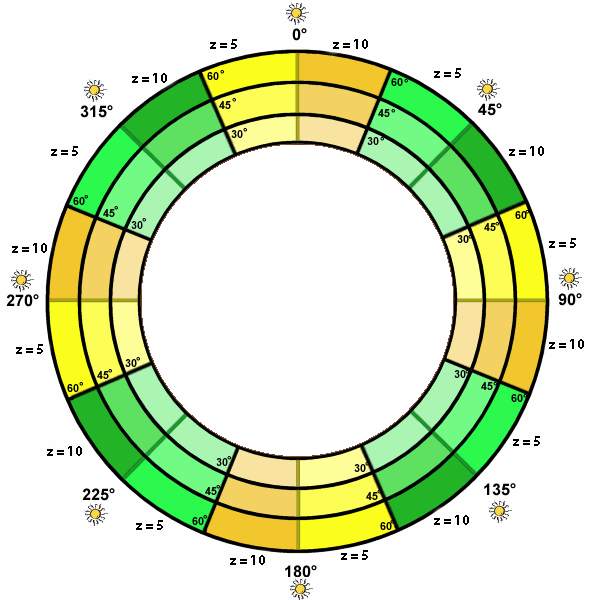 Move your mouse over a segment of the outside ring of the circle to view examples of shaded relief images at different azimuths, altitudes and z-factors. Click on a segment to start the zip/exe download.