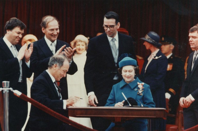 Pierre Elliot Trudeau (seated) and the Queen Elizabeth II prepare to sign Constitutional proclamation, as Consumer Affairs Minister André Ouellet (left), Secretary of State Gerald Regan (centre) and Privy Council Clerk Michael Pitfield (right) look on - photo credit: Robert Cooper/National Archives of Canada
