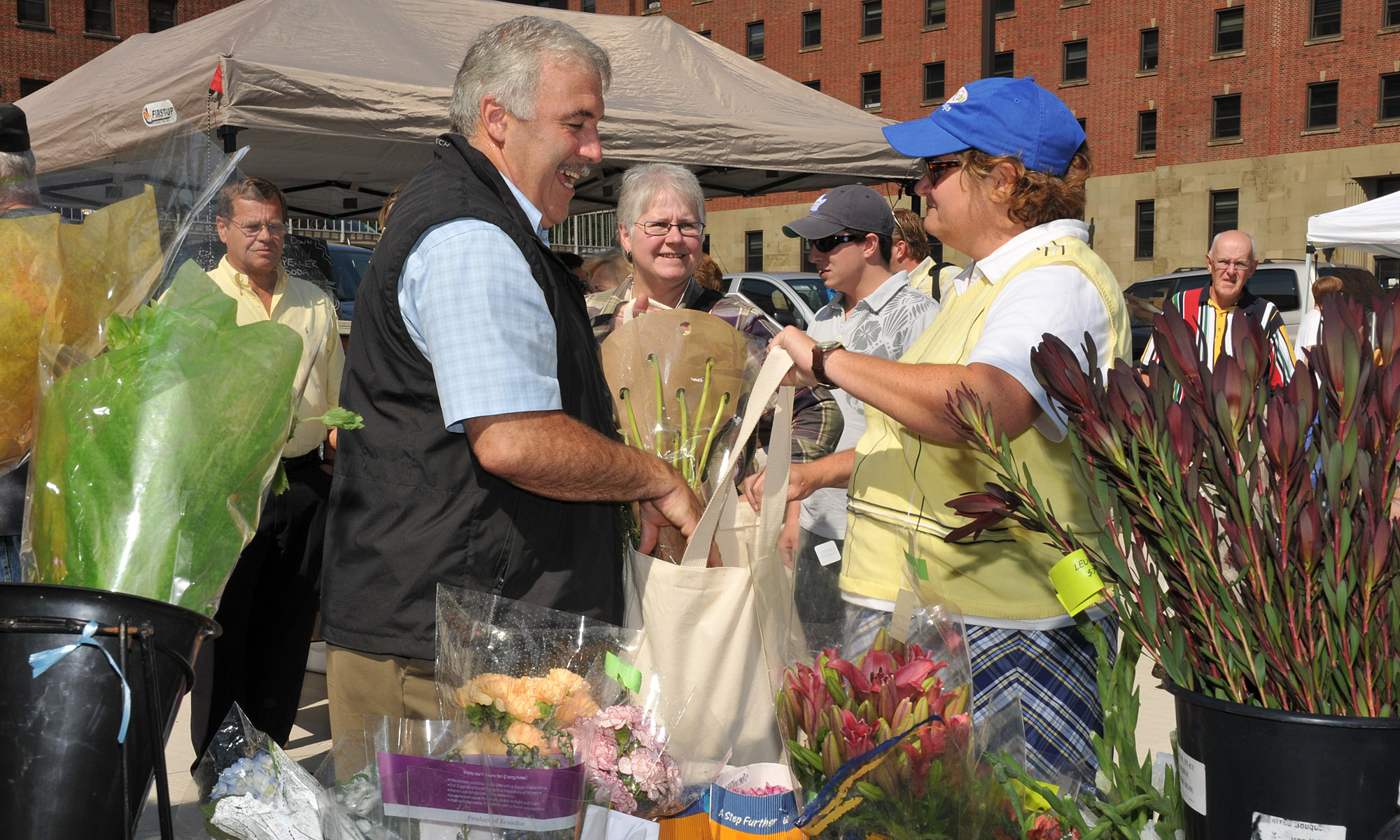 Agriculture Minister John MacDonell buys some flowers from Penny Taylor during a trip to the farmers' market at the QEII Health Sciences Centre. Download high-res version