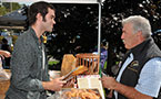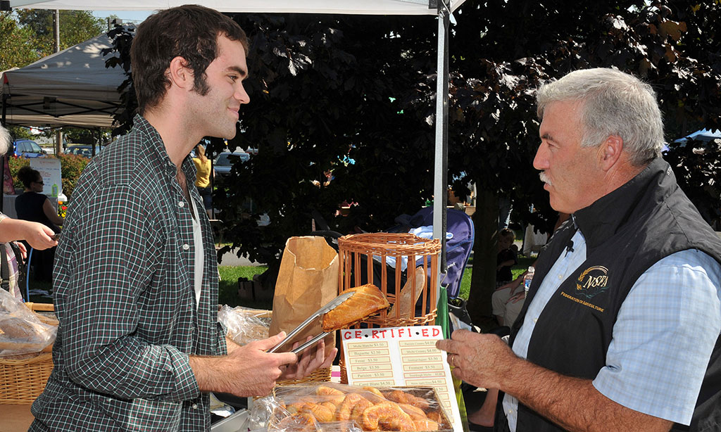 Agriculture Minister John MacDonell buys a snack from Spencer Fowlie at a farmers' market during the Eat Atlantic challenge. Download high-res version