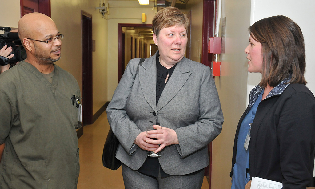 From left, Raymond Wright, a staff member at the Nova Scotia Cancer Centre, Health Minister Maureen MacDonald and Erin Brown, cancer centre staff, chat at an event announcing announce a $14-million investment to improve cancer care and wait times in Nova Scotia.