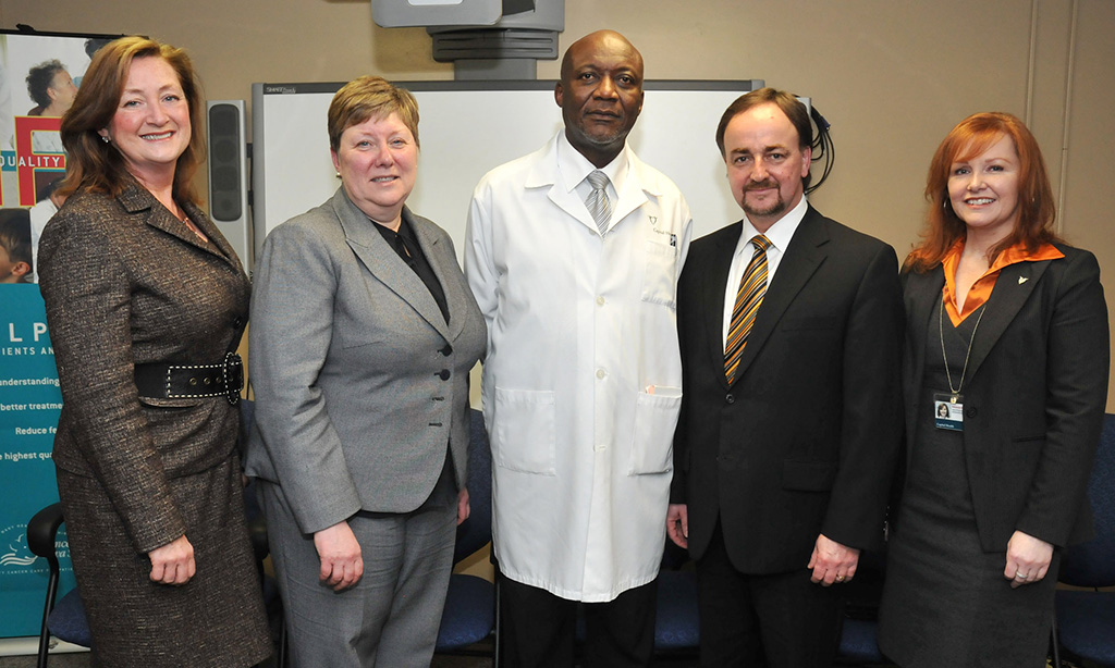 From left, Theresa Marie Underhill, chief operating officer Cancer Care Nova Scotia; Health Minister Maureen MacDonald; Dr. Tetteh Ago, chief of radiation oncology for Capital Health; Bruce Marchand, vice-chair of the QEII Foundation's volunteer board of trustees; and Amanda Whitewood, chief financial officer, Capital District Health Authority at the event announcing announce a $14-million investment to improve cancer care and wait times in Nova Scotia.