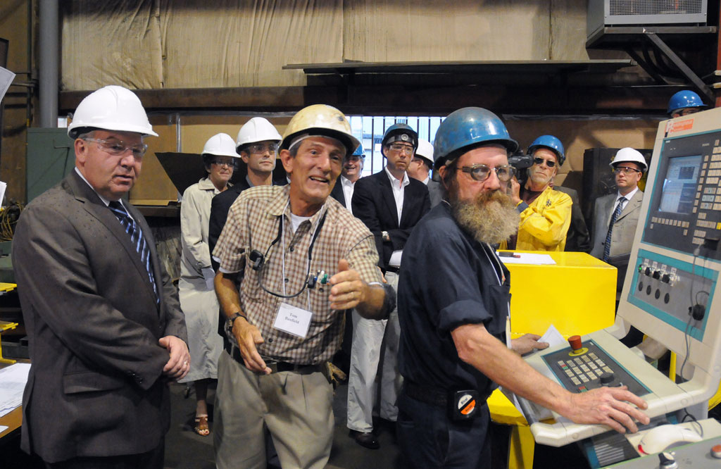 Tom Banfield (centre) and Leo Lirette (right) explain their work to Premier Darrell Dexter at RKO in Dartmouth.